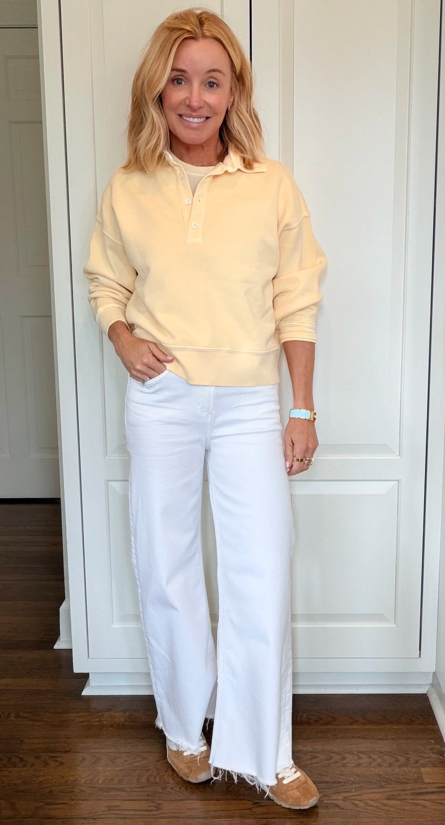 Butter yellow is almost a creamy pastel — not bold, not neon, not overwhelming. It pairs beautifully with the neutral pieces I already live in: tan, beige, brown, and white. It instantly lightens everything up without screaming spring.
