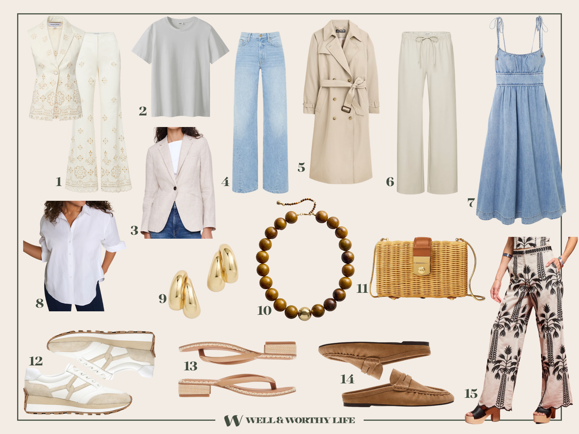 1. The Off-White Suit Vest & Pant / 2. The White Tee / 3. The Linen Blazer / 4. Lemon Twist Jeans / 5. The Trench / 6. Drawstring Pants / 7. Denim Dress / 8. The Classic Button Down / 9. Statement Earrings / 10. Bold Necklace / 11. The Clutch / 12. Cool-Girl Sneaker / 13. Go-With-Everything Sandal / 14. Loafer / 15. Statement Pants